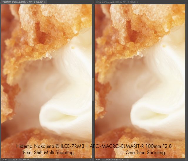 約4200万画素のRです。いわゆる「等倍」の100%表示をして、1回撮影とピクセルシフトマルチ撮影のカットを並べて見ました。右が1回撮影、左がピクセルシフトマルチ撮影です。以前建築物でピクセルシフトマルチ撮影をやった時には、如実に違いが出たのですが、あまり違いが見出せず。もしかしたら、AMEというレンズのおかげかもしれませんけど。まぁ、このカットはF8ぐらいなので、結構ボケの場所も多いしってことで。